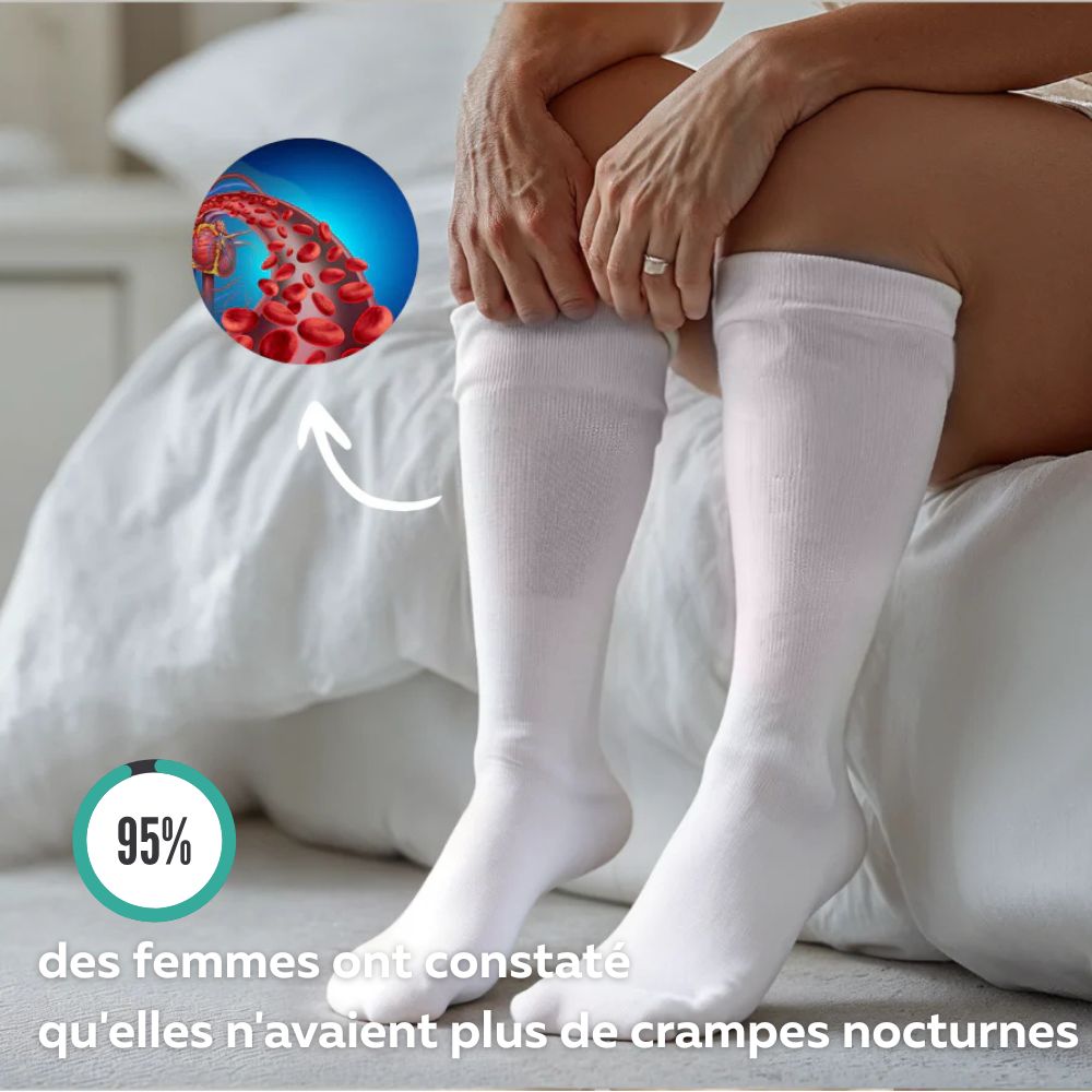 Nos chaussettes de compression offrent un soutien musculaire constant pendant la nuit, prévenant ainsi les crampes en maintenant vos muscles au chaud et détendus.